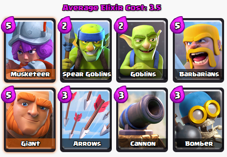 Best giant musketeer deck. Arena 1 3 giant prince musketeer bomber arrows fireball goblins spear goblins. Battle ram giant and three musketeers are your win conditions. According to deckshop royal giant generally has good synergies with furnace miner and ice wizard. The giant is easily the best card in these arenas.